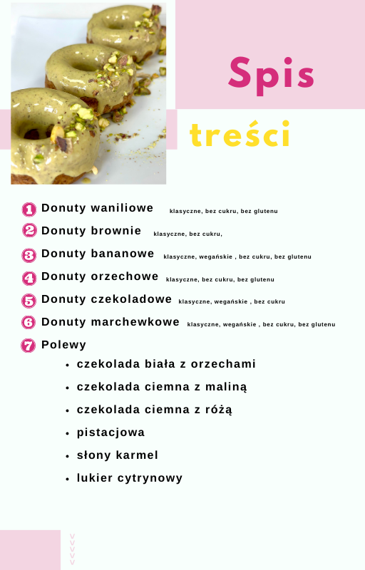 E-book zawiera przepisy na donuty w kilku wersjach, dzięki czemu każdy znajdzie coś dla siebie: